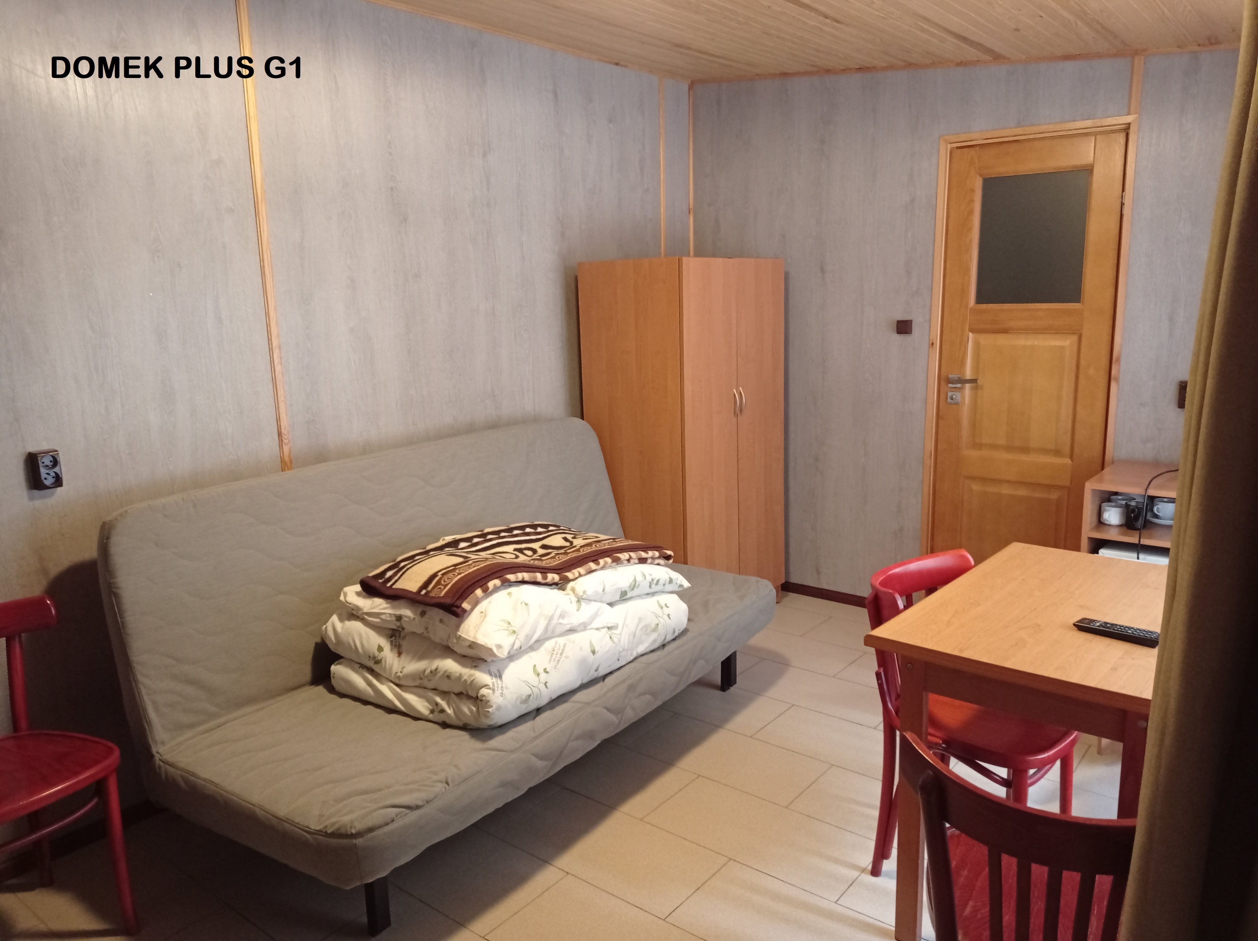 Wyposażenie każdego domku kempingowego plus gwarantuje niezbędne udogodnienia w postaci dwóch łóżek i rozkładanej kanapy. Przewidziana jest także możliwość dostawienia łóżeczka dla dzieci. Wszystkie domki kempingowe posiadają również łazienkę z pełnym węzłem sanitarnym. Na wyposażeniu znajduje się szafa ubraniowa, stół z krzesłami, lodówka. Istnieje możliwość wypożyczenia czajnika w recepcji.